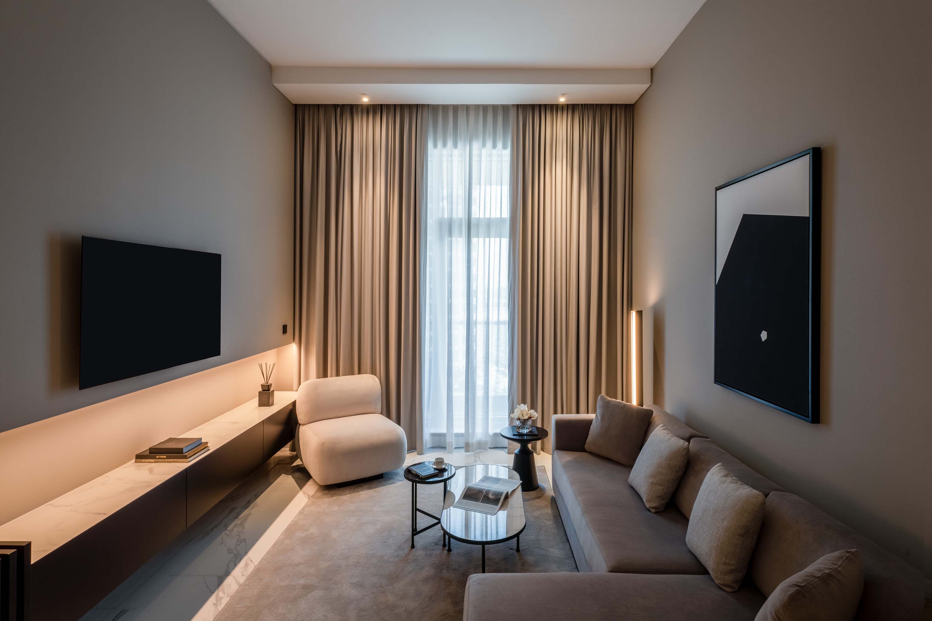 This 80 square meter one-bedroom apartment with balcony has a contemporary interior design with bright accents overlooking city . Its living room has a 1 sofa cum bed , 1 armchair , 4 dinning seats set with 55 inches LED TV and a work desk. It has a bathroom with a walk-in shower, sets of linen, a hairdryer, and a bathroom scale. The room provides the comfort of one’s home with complimentary Wi-Fi access on an unlimited number of devices, a fully equipped kitchen with a countertop complete with refrigerator, dishwasher, microwave, toaster, coffee & tea facilities, utensils, 3-seat dining table and washing machine. The separate bedroom is complete with iron & board, a luggage rack, a work desk, coffee table and wardrobe. It has a balcony with a coffee table for 2 to provide more space for relaxation.